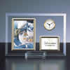 アルミ材のシルバー色と本革のブラウンのコンビがおしゃれなフォトフレーム&クォーツ時計です。時と共に思い出を飾る一品です。